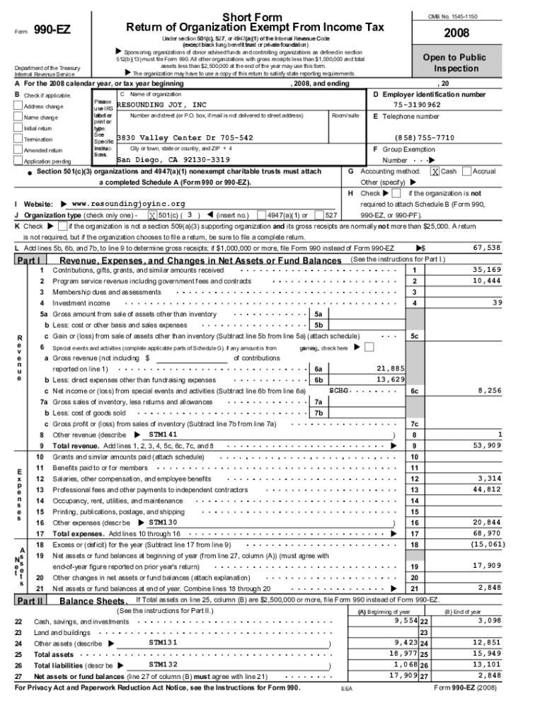 Form Short Form Return of Organization Exempt From Income Tax990EZOMB No. 154511502008Under n r section e i 50 501(c), (c), 5527, 7 Orr 4947(a)(1) 9 (a (1 of the e Internal a Revenue even e C Code