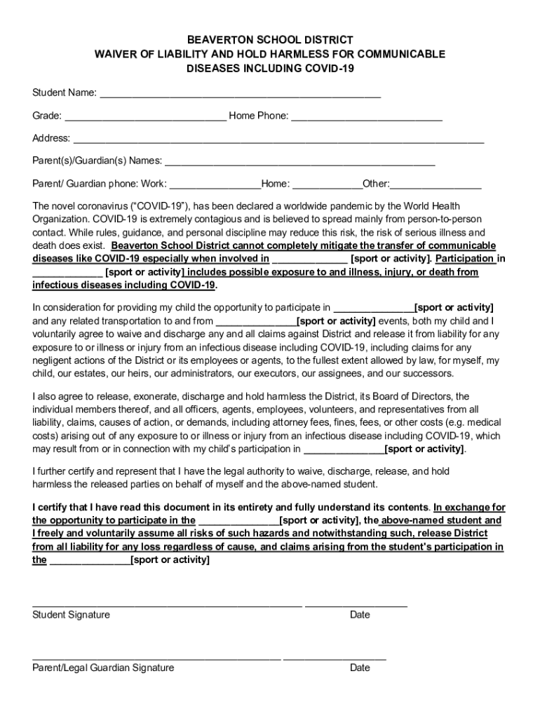 BEAVERTON SCHOOL DISTRICT WAIVER OF LIABILITY AND HOLD HARMLESS FOR COMMUNICABLE DISEASES INCLUDING COVID-19 Student Name: Grade: Home Phone: Address: Parent(s)/Guardian(s) Names: Parent/ Guardian