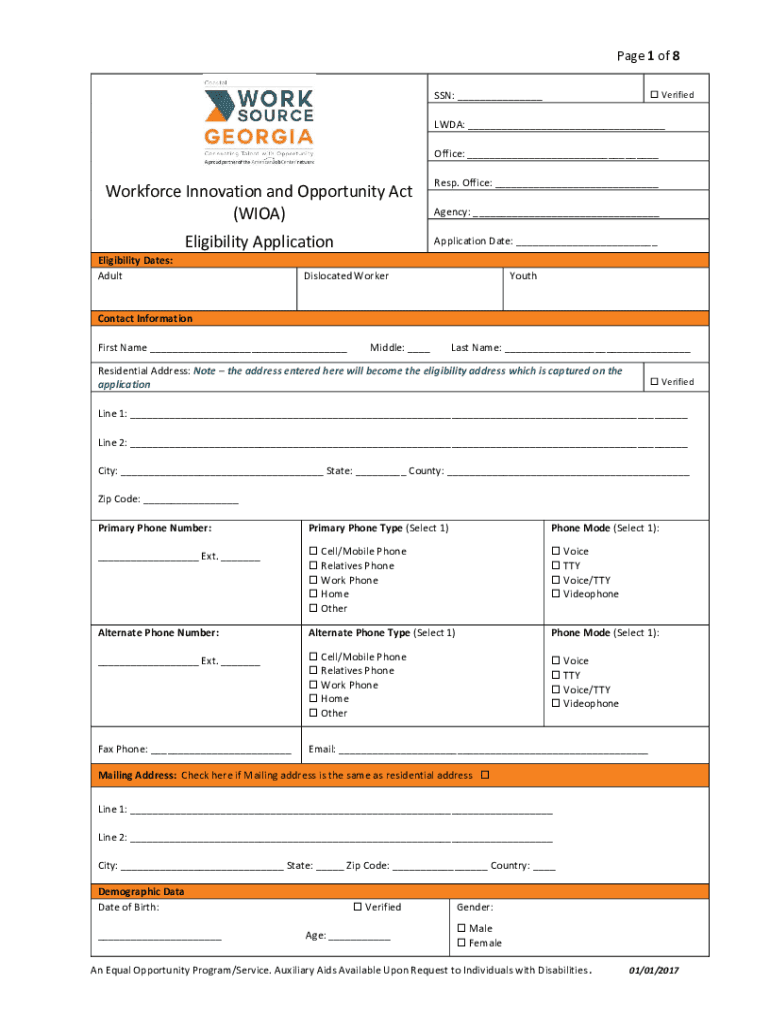 Page 1 of 8 Verified: LDA: Office: Workforce Innovation and Opportunity Act (WHOA)Resp. Office: Eligibility ApplicationApplication Date: Eligibility Dates: Multiagency: Dislocated WorkerYouthContact
