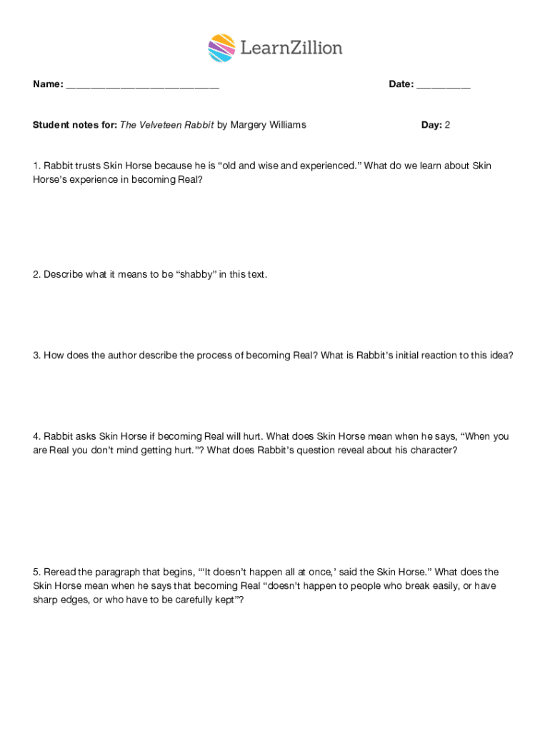 Name: Student notes for: The Velveteen Rabbit by Margery WilliamsDate: Day: 21. Rabbit trusts Skin Horse because he is old and wise and experienced. What do we learn about Skin Horses experience in