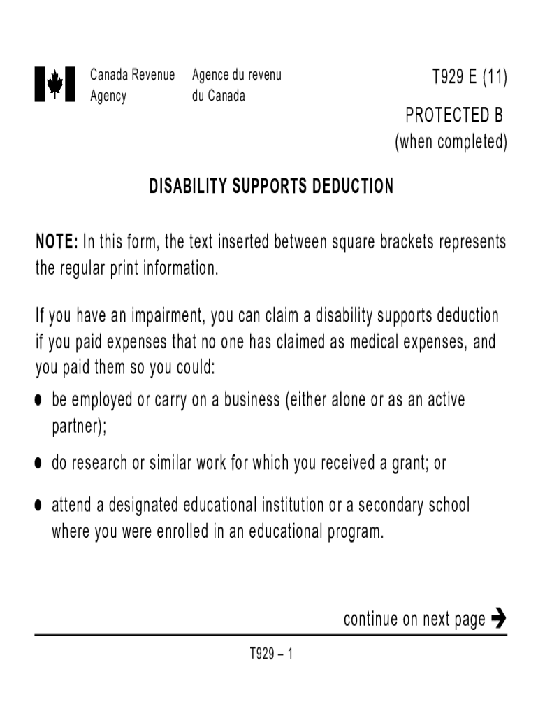 Canada Revenue AgencyT929 E (11)Agency Du revenue Du CanadaPROTECTED B (when completed)DISABILITY SUPPORTS DEDUCTION NOTE: In this form, the text inserted between square brackets represents the regular