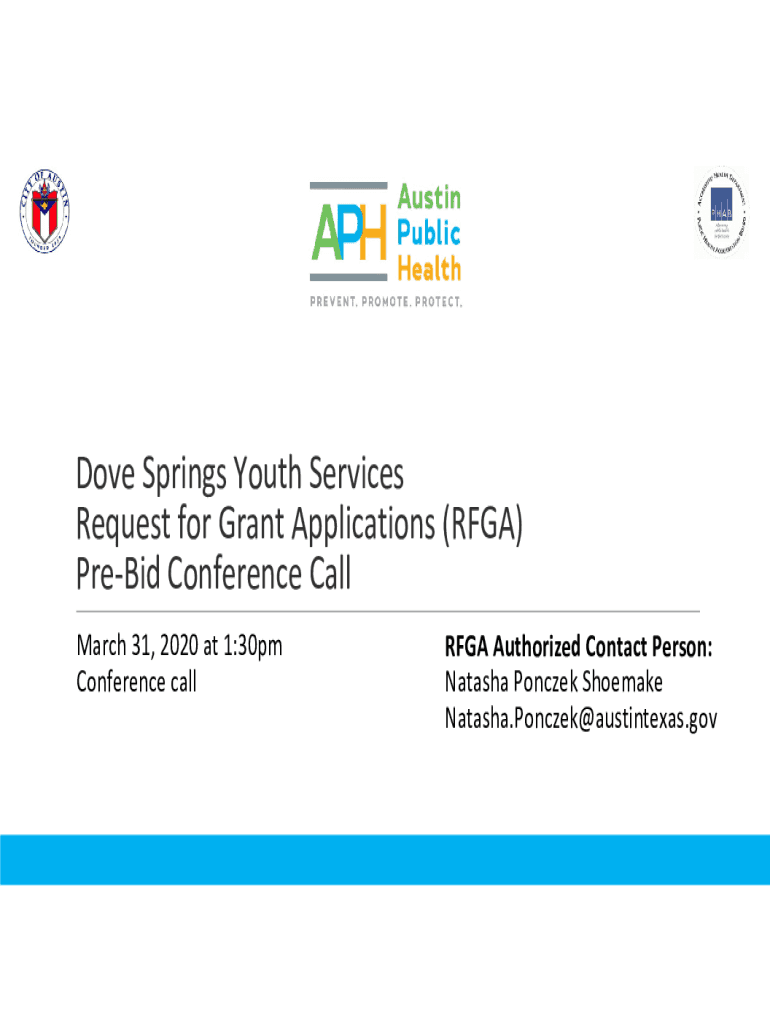 DoveSpringsYouthServices RequestforGrantApplications(RIGA) PreBidConferenceCall March31,2020at1:30pm ConferencecallRFGAAuthorizedContactPerson: NatashaPonczekShoemake Natasha. Ponce austintexas. Agenda