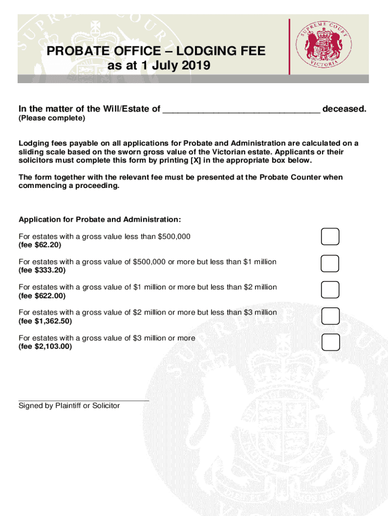 PROBATE OFFICE LODGING FEE as at 1 July 2019In the matter of the Will/Estate of deceased. (Please complete)Lodging fees payable on all applications for Probate and Administration are calculated on