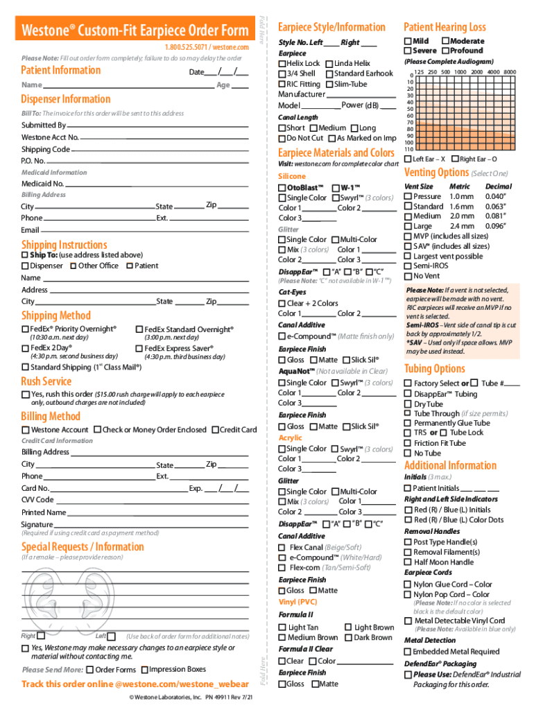 To fill out a Westone custom-fit earpiece order, follow these steps: