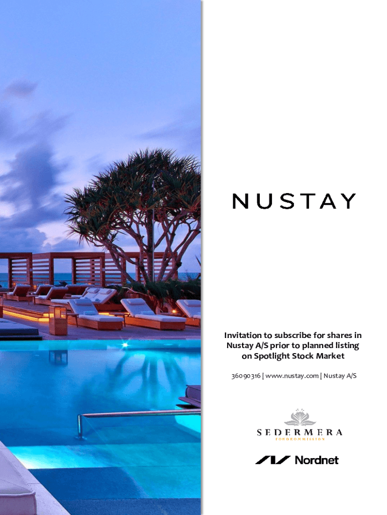 Invitation to subscribe for shares in Nu stay A/S prior to planned listing on Spotlight Stock Market 36090316 www.nustay.com Nu stay A/S.ABOUT THIS PROSPECTUS Definitions In this Prospectus, the following