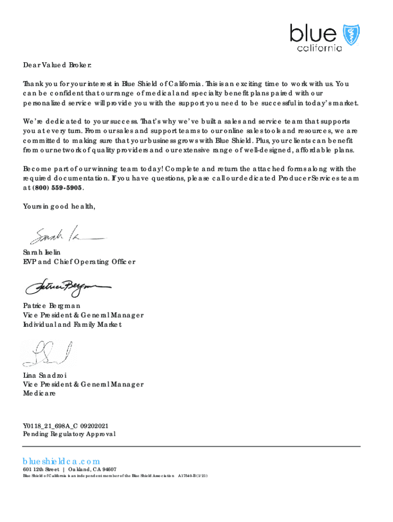Dear Valued Broker: Thank you for your interest in Blue Shield of California. This is an exciting time to work with us. You can be confident that our range of medical and specialty benefit plans paired