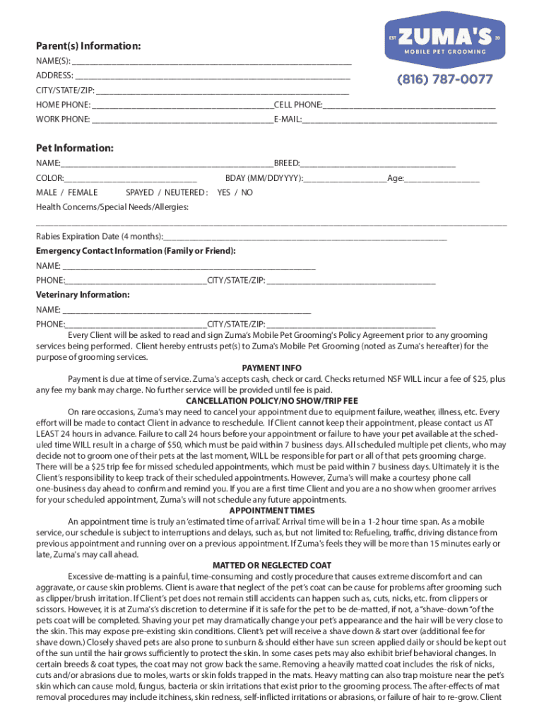Parent(s) Information: NAME(S): ADDRESS: CITY/STATE/ZIP: HOME PHONE: CELL PHONE: WORK PHONE: EMAIL: Pet Information: NAME: BREED: COLOR: MALE / FEMALESPAYED / NEUTERED :DAY (MM/DRYLY): Age: YES /