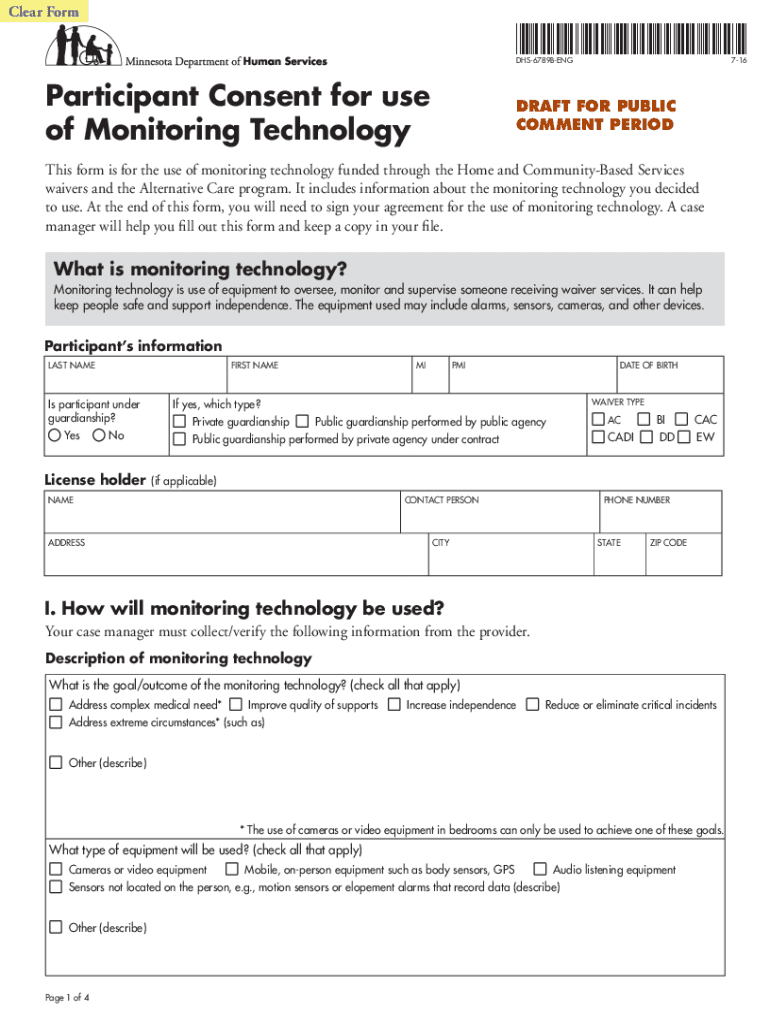Clear Form×DHS6789BENG* DHS6789BENGParticipant Consent for use of Monitoring Technology716DRAFT FOR PUBLIC COMMENT Periods form is for the use of monitoring technology funded through the Home and