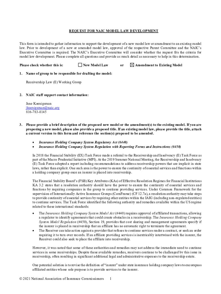 Get the free REQUEST FOR NAIC MODEL LAW DEVELOPMENT Please check ...