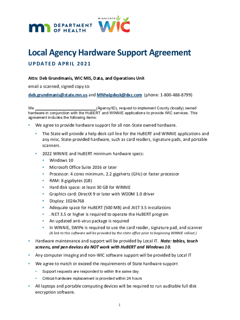 Local Agency Hardware Support Agreement UPDATED APRIL 2021 Attn: Deb Grandmas, WIC MIS, Data, and Operations Unit email a scanned, signed copy to: deb.grundmanis@state.mn.us and MNhelpdesk@dxc.com
