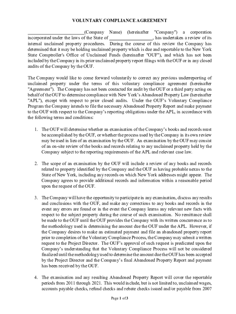 VOLUNTARY COMPLIANCE AGREEMENT (Company Name) (hereinafter Company “) a corporation incorporated under the laws of the State of, has undertaken a review of its internal unclaimed property procedures.