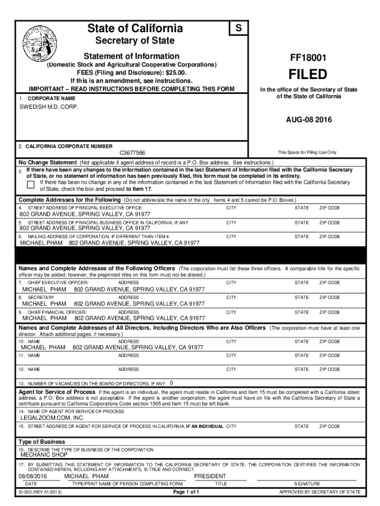 State of CaliforniaSSecretary of State Statement of InformationFF18001(Domestic Stock and Agricultural Cooperative Corporations)FEES (Filing and Disclosure): $25.00. If this is an amendment, see instructions.FILEDIMPORTANT