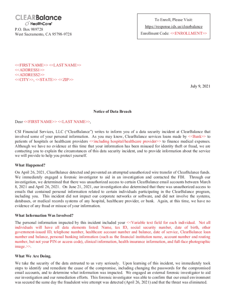 RecordIndicator000817To Enroll, Please Visit: https://response.idx.us/clearbalanceP. O. Box 989728 West Sacramento, CA 957989728Enrollment Code: ENROLLMENTFIRST NAME LAST NAME ADDRESS1 ADDRESS2 CITY,
