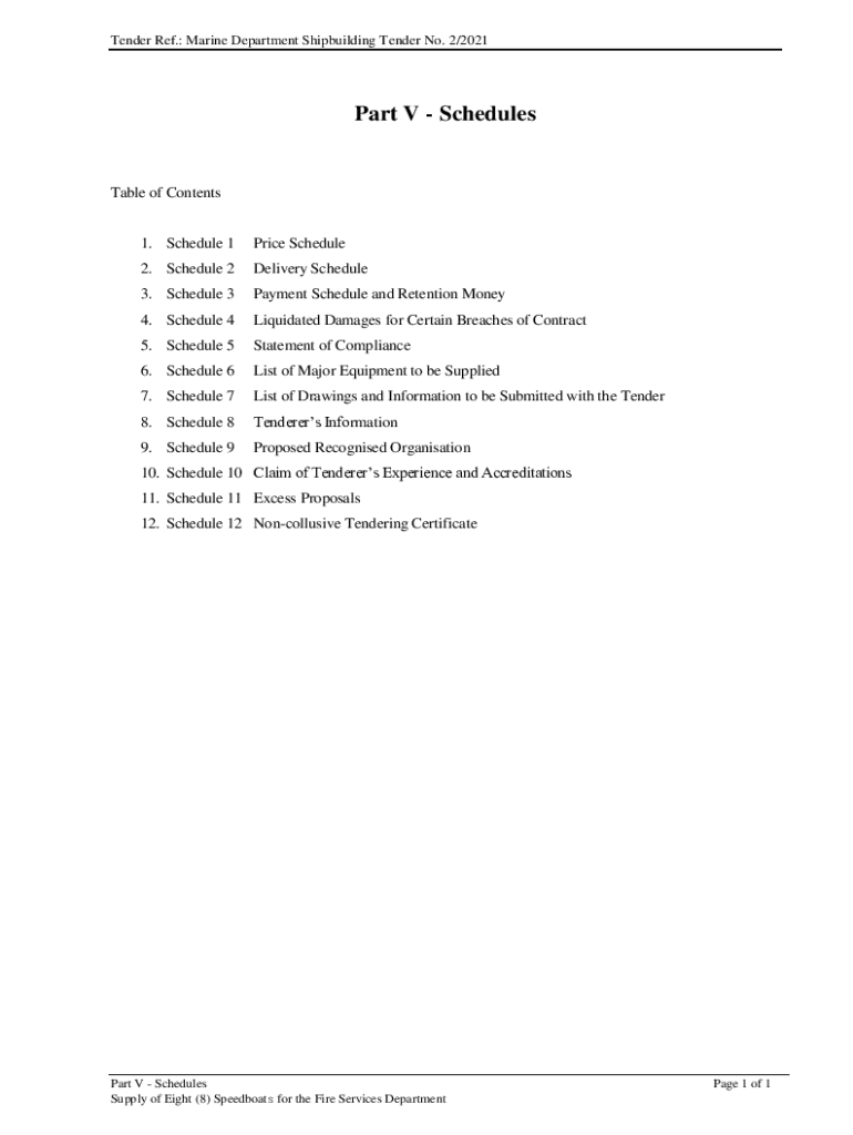 Tender Ref.: Marine Department Shipbuilding Tender No. 2/2021Part V SchedulesTable of Contents1. Schedule 1Price Schedule2. Schedule 2Delivery Schedule3. Schedule 3Payment Schedule and Retention Money4.