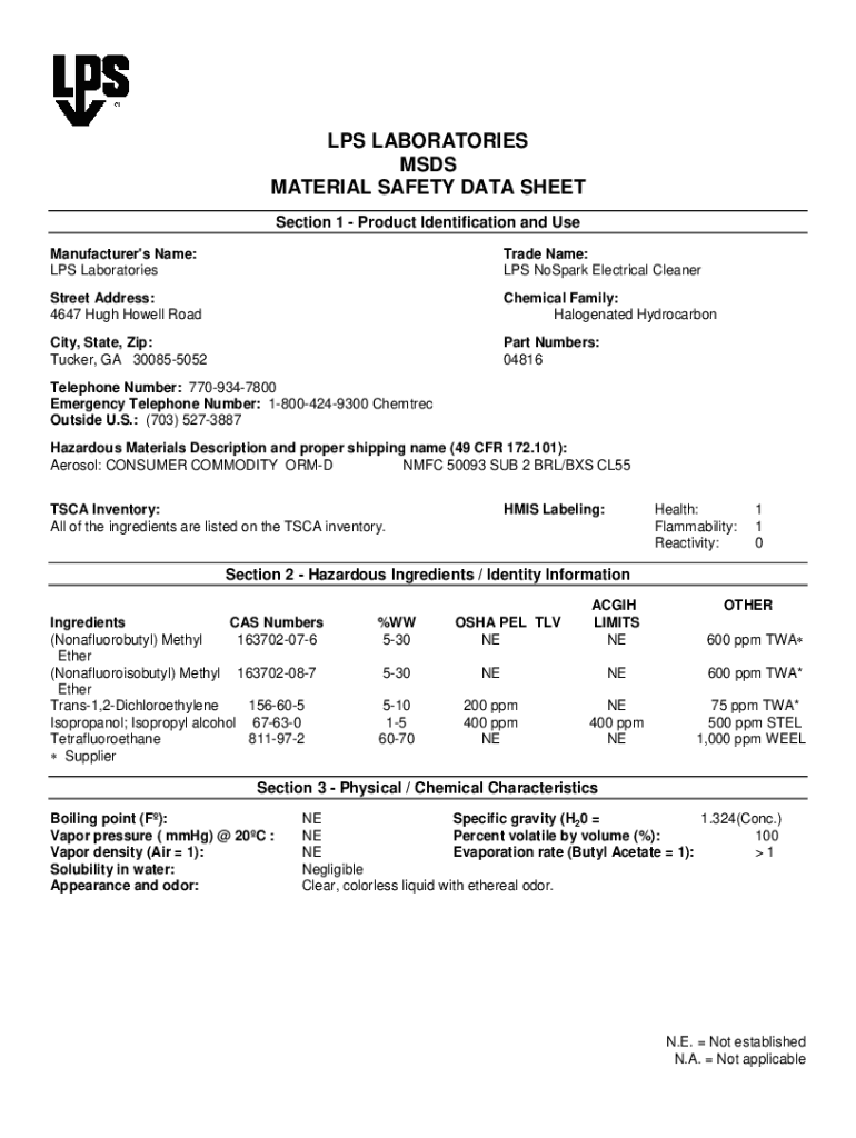 LPS LABORATORIES MSDS MATERIAL SAFETY DATA SHEET Section 1 Product Identification and Use Manufacturer\'s Name: LPS LaboratoriesTrade Name: LPS No Spark Electrical CleanerStreet Address: 4647 Hugh