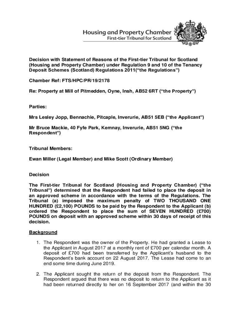 Decision with Statement of Reasons of the First tier Tribunal for Scotland (Housing and Property Chamber) under Regulation 9 and 10 of the Tenancy Deposit Schemes (Scotland) Regulations 2011(the Regulations)