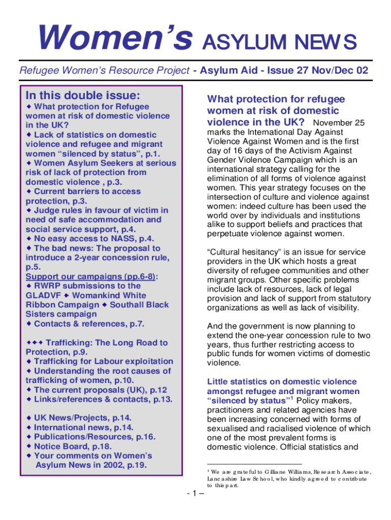 WomensASYLUM NEWSRefugee Women's Resource Project Asylum Aid Issue 27 Nov/Dec 02In this double issue:What protection for refugee women at risk of domestic violence in the UK? November 25What protection