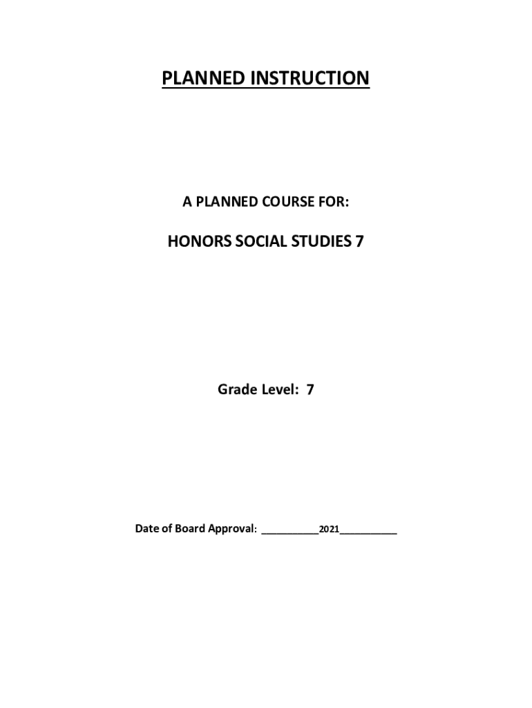 PLANNED INSTRUCTION PLANNED COURSE FOR:HONORS SOCIAL STUDIES 7Grade Level: 7Date of Board Approval: 2021 Planned Instruction Title of Planned Instruction: SOCIAL STUDIES Subject Area: CIVICS, GEOGRAPHY,