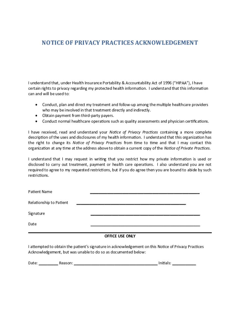 Get the free Notice of Privacy Practices Acknowledgment under the ...