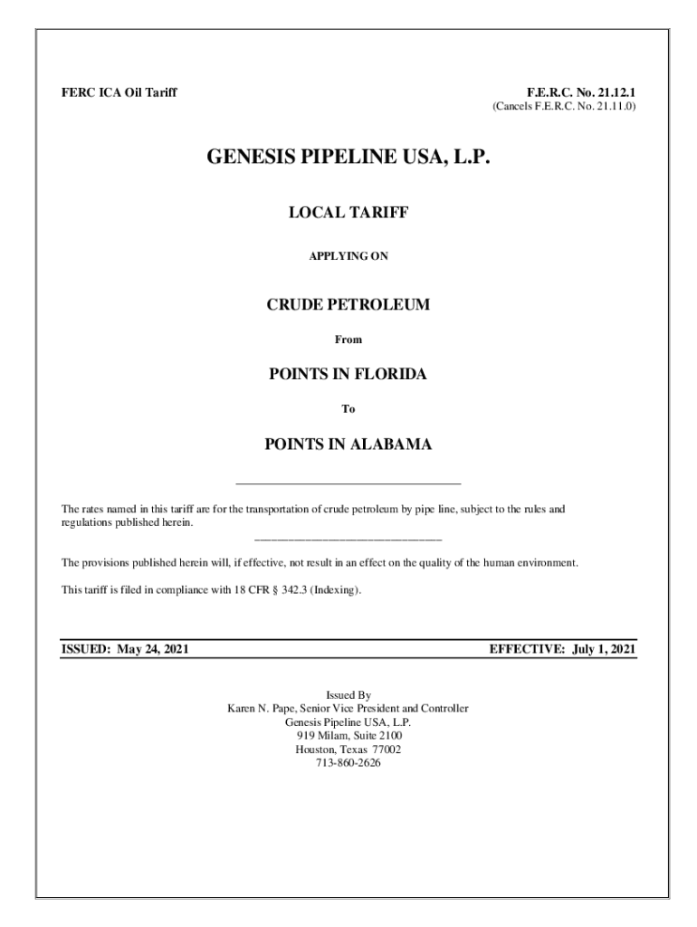FERC ICA Oil Tariff. E.R.C. No. 21.12.1 (Cancels F.E.R.C. No. 21.11.0)GENESIS PIPELINE USA, L.P. LOCAL TARIFF APPLYING to INCLUDE PETROLEUM Footprints IN FLORIDA Points IN ALABAMA The rates named