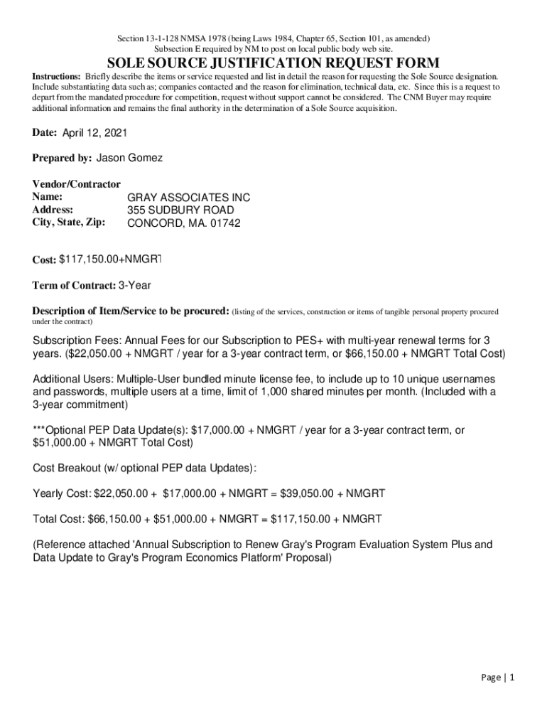 Section 131128 NASA 1978 (being Laws 1984, Chapter 65, Section 101, as amended) Subsection E required by NM to post on local public body website. SOLE SOURCE JUSTIFICATION REQUEST FORM Instructions: