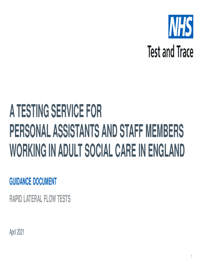 A TESTING SERVICE FOR PERSONAL ASSISTANTS AND STAFF MEMBERS WORKING IN ADULT SOCIAL CARE IN ENGLAND GUIDANCE DOCUMENTRAPID LATERAL FLOW TESTS April 2021 1Contents Summary: Testing for personal assistants