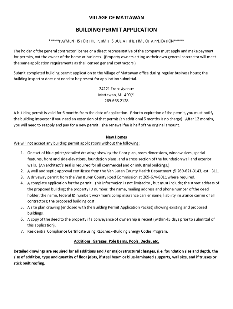 VILLAGE OF MATTAWANBUILDING PERMIT APPLICATION *****PAYMENT IS FOR THE PERMIT IS DUE AT THE TIME OF APPLICATION***** The holder of the general contractor license or a direct representative of the