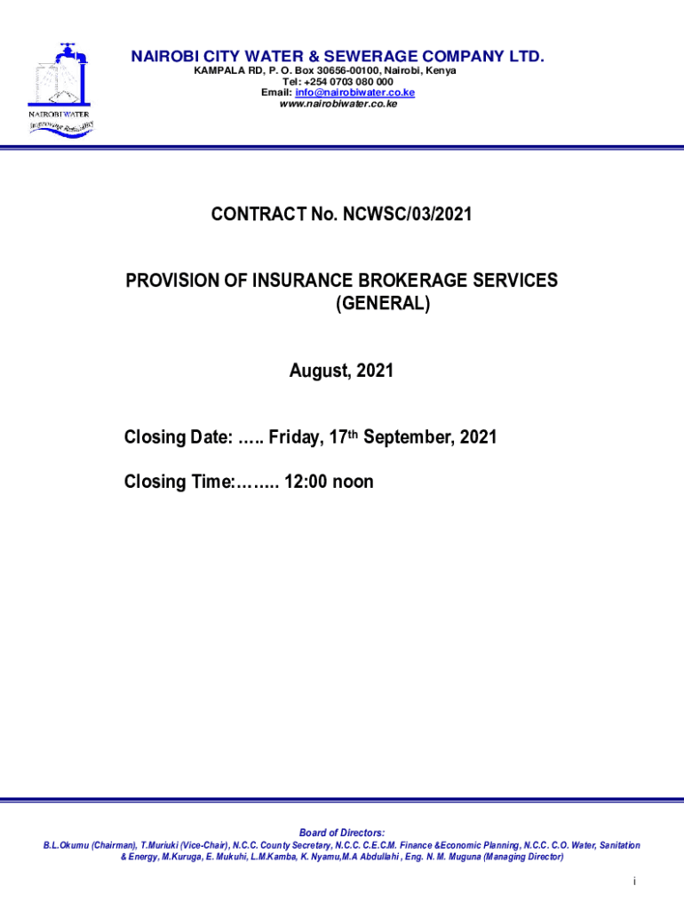 NAIROBI CITY WATER & SEWERAGE COMPANY LTD. KAMPALA RD, P. O. Box 3065600100, Nairobi, Kenya Tel: +254 0703 080 000 Email: info nairobiwater.co.KE www.nairobiwater.co.keCONTRACT No. NC WSC/03/2021