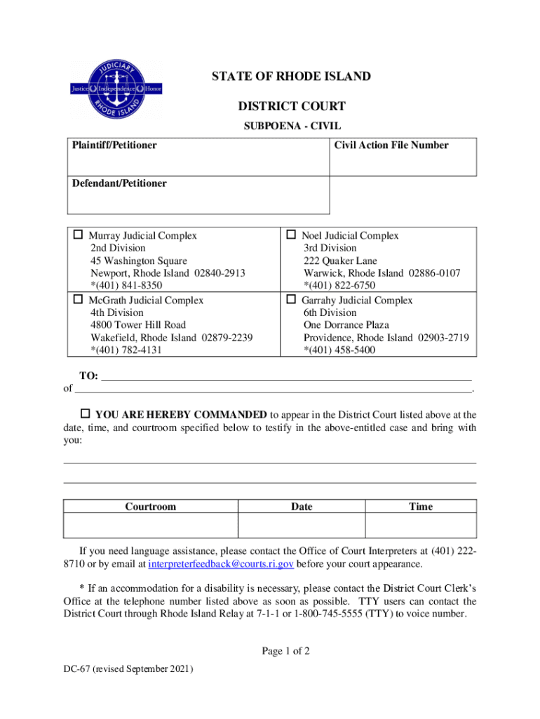 STATE OF RHODE ISLANDDISTRICT COURT SUBPOENA CIVIL Plaintiff/PetitionerCivil Action File NumberDefendant/Petitioner Murray Judicial Complex Noel Judicial Complex2nd Division 45 Washington Square Newport,