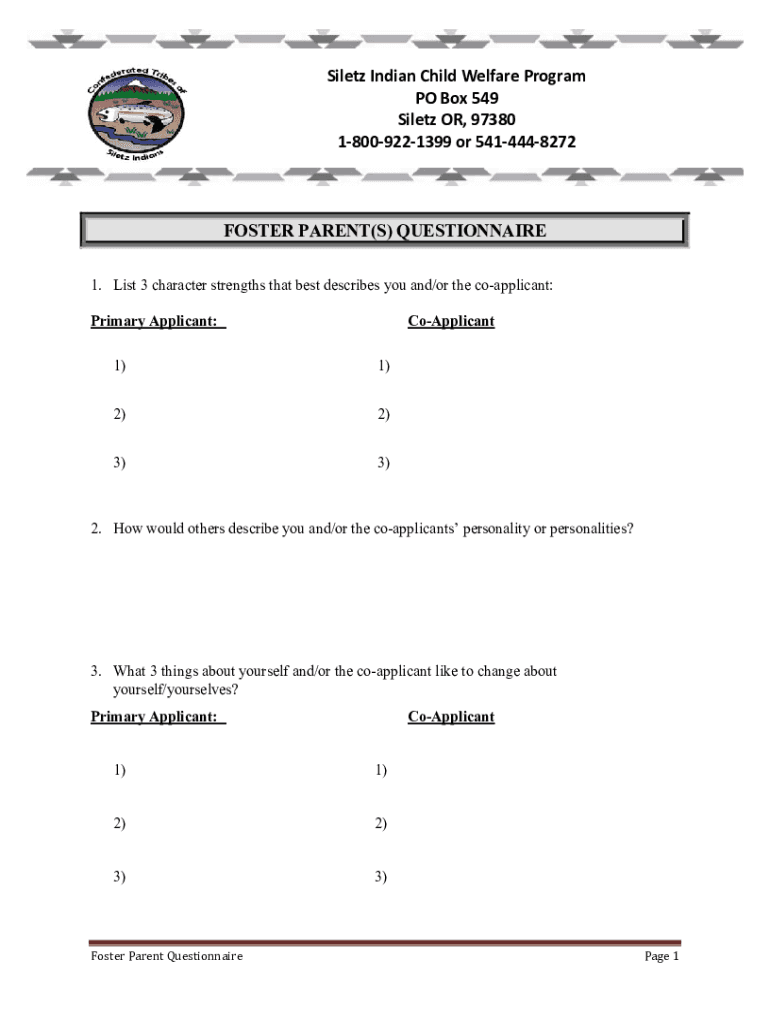 SiletzIndianChildWelfareProgram POBox549 Selector,97380 18009221399or5414448272FOSTER PARENT(S) QUESTIONNAIRE 1. List 3 character strengths that best describes you and/or the coapplicant: Primary