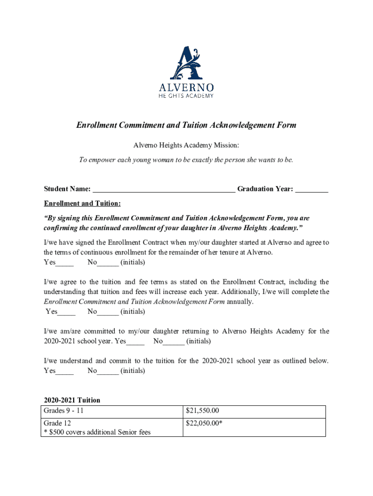 Enrollment Commitment and Tuition Acknowledgement Form Alberto Heights Academy Mission: To empower each young woman to be exactly the person she wants to be. Student Name: Graduation Year: Enrollment