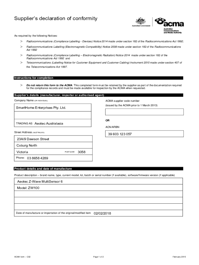 Get the free ZW100 Suppliers Declaration of Conformity - Aeotec