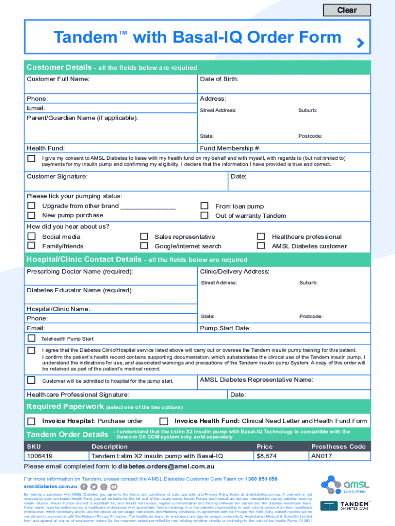 ClearSubmitTandem with Basal IQ Order Form Customer Details all the fields below are required Customer Full Name:Date of Birth:Phone:Address:Email:Street Address:Suburb:State:Postcode:Parent/Guardian