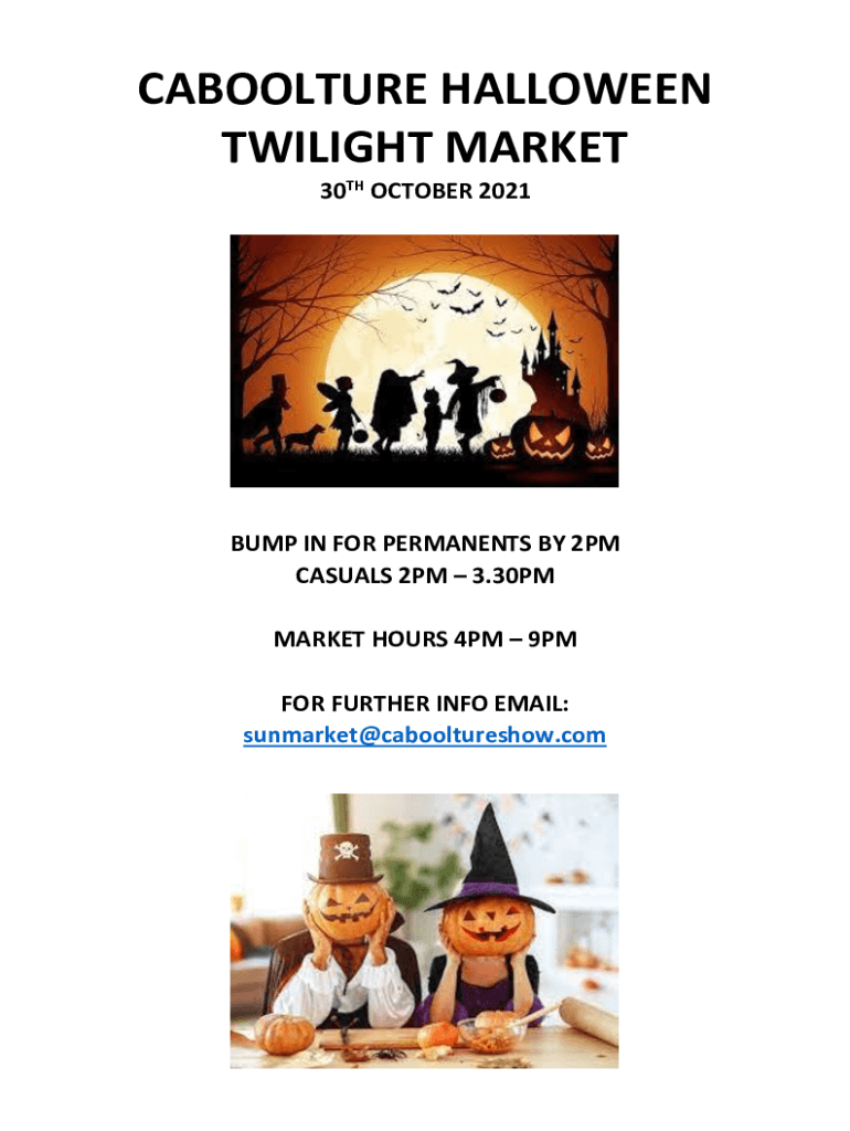 CABOOLTURE HALLOWEEN TWILIGHT MARKET 30TH OCTOBER 2021BUMP IN FOR PERMANENTS BY 2PM CASUALS 2PM 3.30PM MARKET HOURS 4PM 9PM FOR FURTHER INFO EMAIL: sun market cabooltureshow.comCABOOLTURE MARKETS
