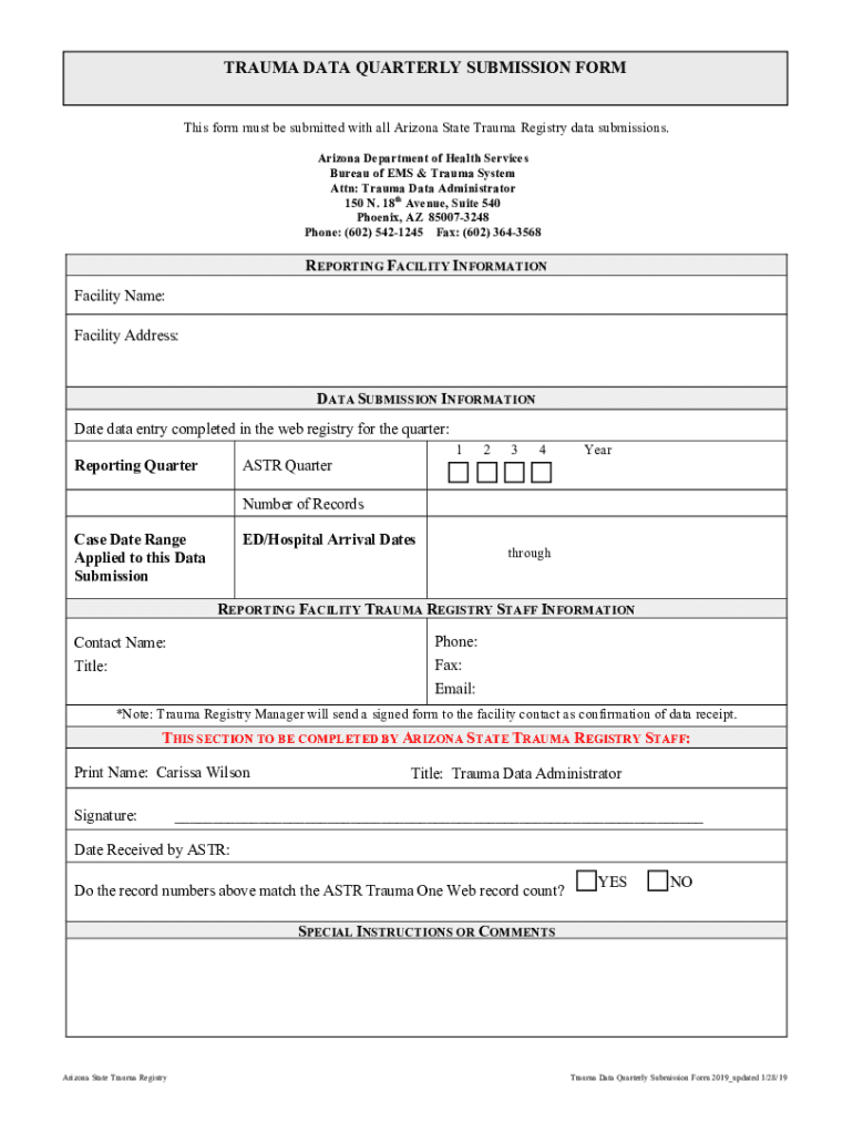 TRAUMA DATA QUARTERLY SUBMISSION FORM This form must be submitted with all Arizona State Trauma Registry data submissions. Arizona Department of Health Services Bureau of EMS & Trauma System Attn: