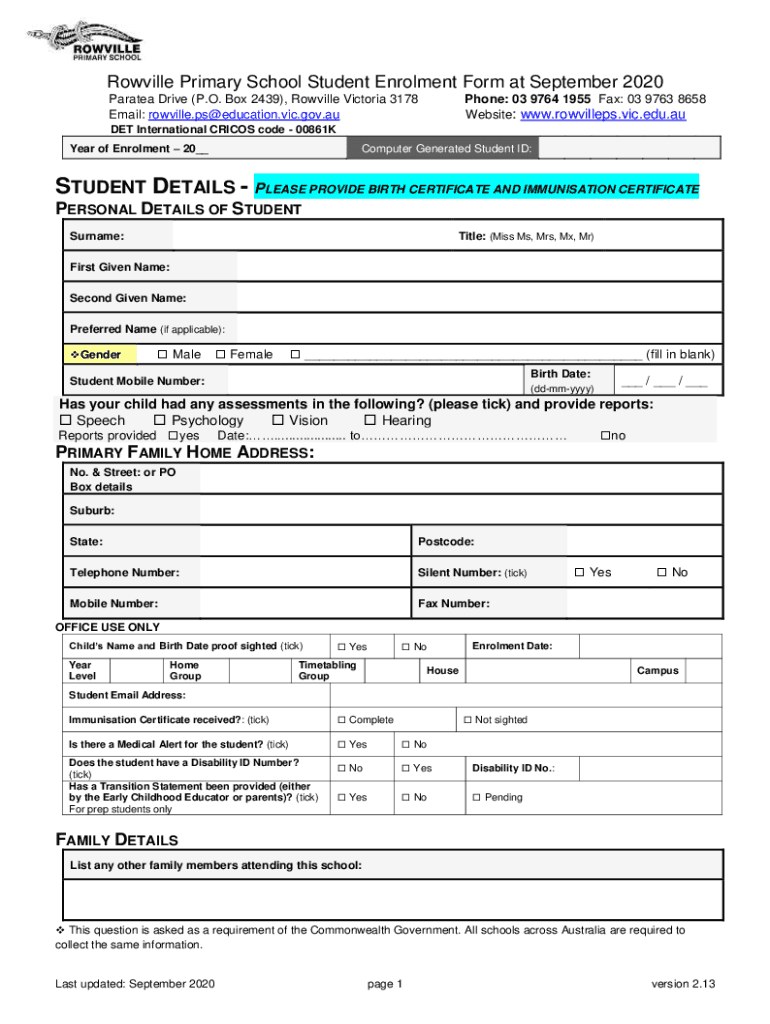 Get the free STUDENT ENROLMENT INFORMATION CASES21 STUDENT ID STUDENT ... - rowvilleps vic edu