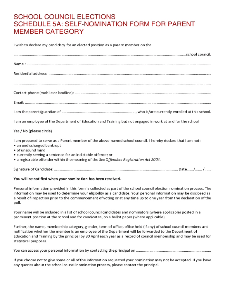Get the free School Council Elections Schedule 5A Self-nomination Form ...