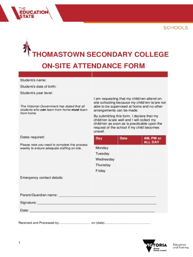 THOMASTON SECONDARY COLLEGE ONSITE ATTENDANCE FORM Student/s name: Student/s date of birth: Student/s year level:The Victorian Government has stated that all students who can learn from home must