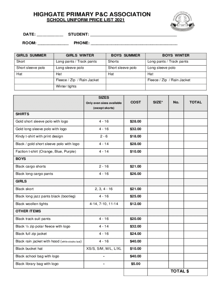 The HIGHEST PRIMARY P&C ASSOCIATION SCHOOL UNIFORM PRICE LIST 2021STUDENT: DATE: ROOM: GIRLS SUMMERHOUSE: GIRLS INTERIORS SUMMERS WINTERSkortLong pants / Track pantsShortsLong pants / Track pants