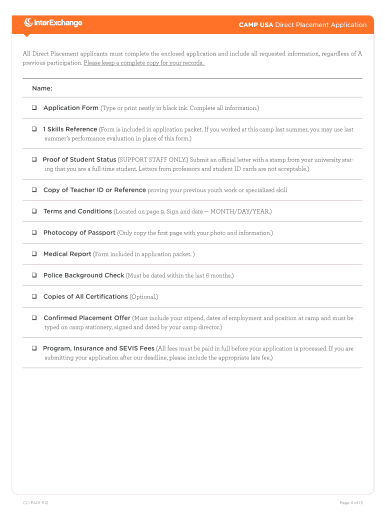 The application is designed for foreign nationals who are students, teachers, or youth workers with skills pertinent to working at summer camps in the United States.
