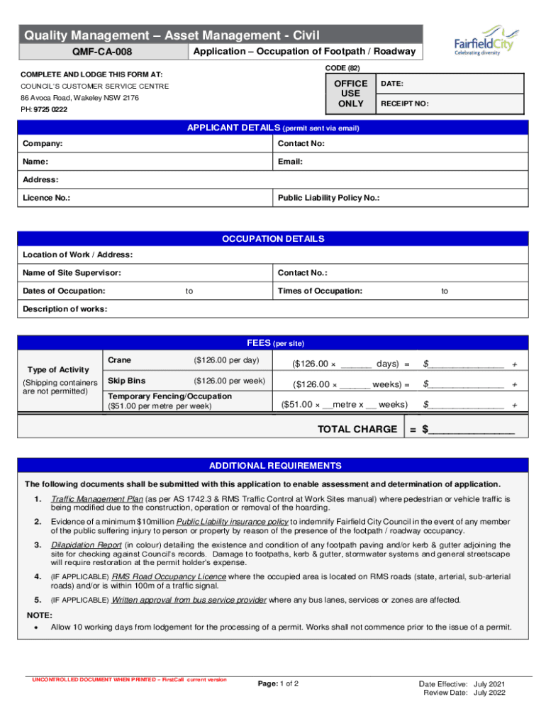 Quality Management Asset Management Civil Application Occupation of Footpath / RoadwayQMFCA008CODE (82) COMPLETE AND LODGE THIS FORM AT:OFFICE USE ONLYCOUNCILS CUSTOMER SERVICE Center 86 Avoid Road,