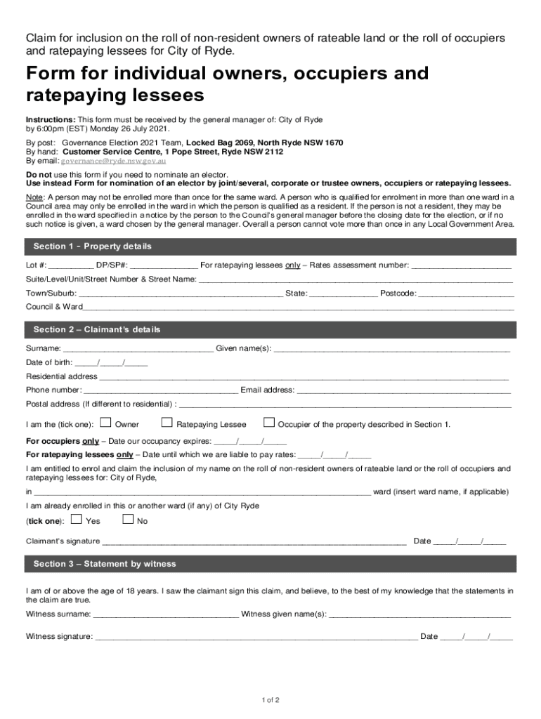Claim for inclusion on the roll of nonresident owners of hateable land or the roll of occupiers and rate paying lessees for City of Ride. Form for individual owners, occupiers and rate paying lessees
