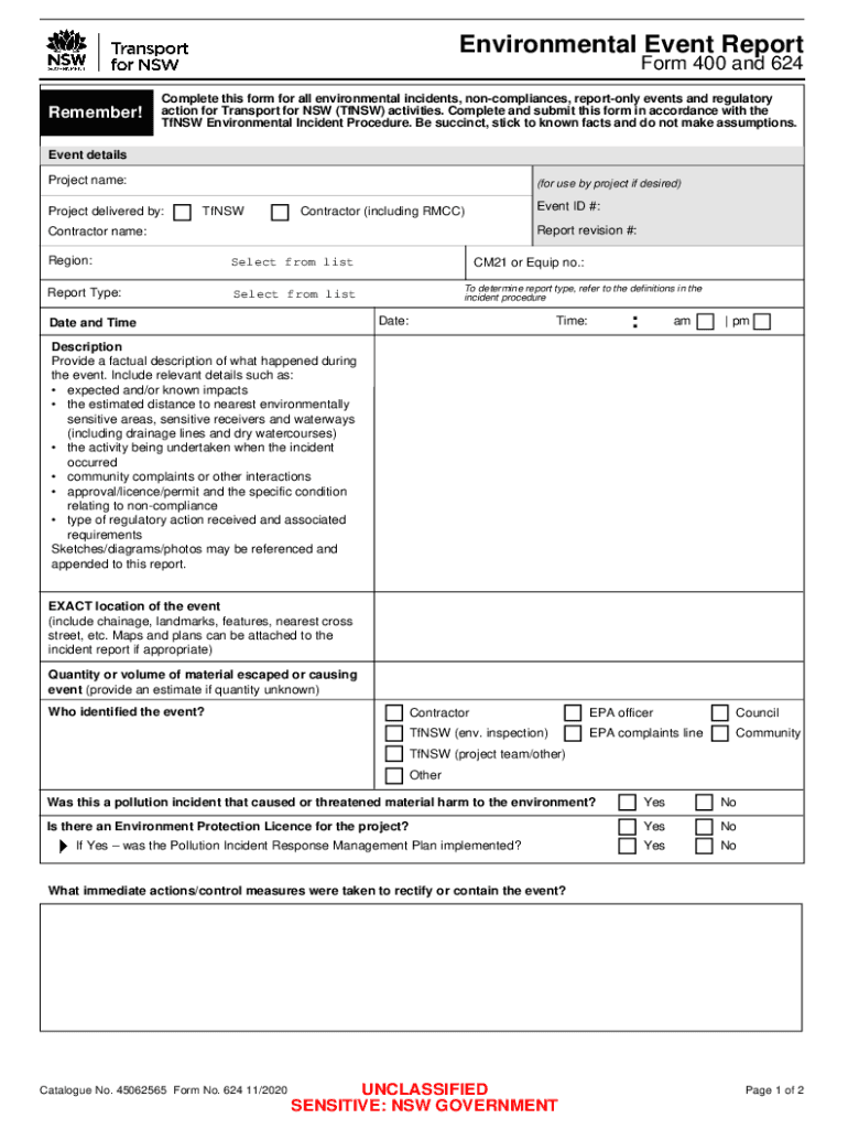 Environmental Event Report Form 400 and 624Remember! Complete this form for all environmental incidents, noncompliance, report only events and regulatory action for Transport for NSW (Tons) activities.