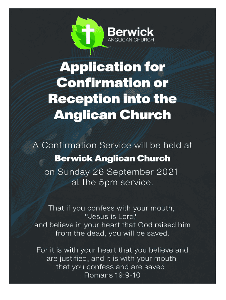 Anyone who wishes to be confirmed in the Berwick Anglican church needs to fill out the Berwick Anglican Confirmation application.