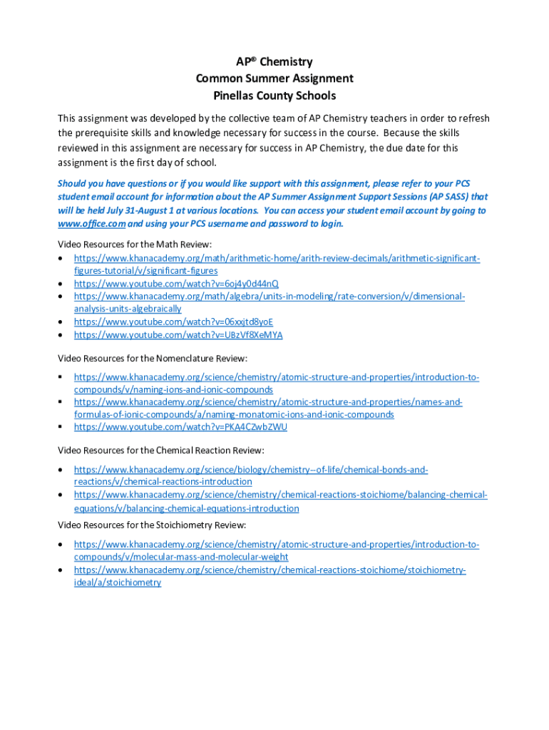 AP Chemistry Common Summer Assignment Pinellas County Schools This assignment was developed by the collective team of AP Chemistry teachers in order to refresh the prerequisite skills and knowledge