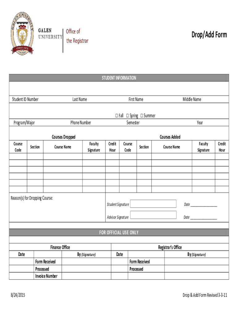 GALEN UNIVERSITYOffice drop/Add Form the RegistrarSTUDENT INFORMATIONStudent ID Numberless Reprogram/MajorFirst Name Fall Spring Summer SemesterPhone Number Courses DroppedCourse CodeSectionCourse