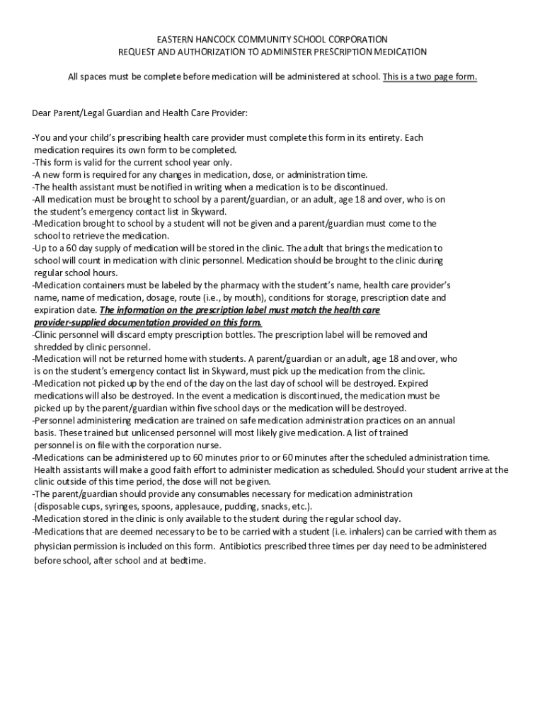 EASTERN HANCOCK COMMUNITY SCHOOL CORPORATION REQUEST AND AUTHORIZATION TO ADMINISTER PRESCRIPTION MEDICATION All spaces must be complete before medication will be administered at school. This is a