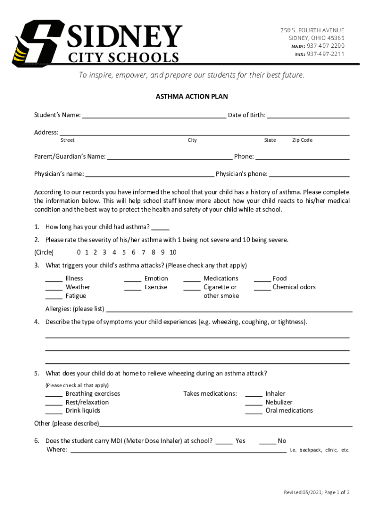 750 S. FOURTH AVENUE SIDNEY, OHIO 45365 MAIN : 9374972200 Faxes : 9374972211To inspire, empower, and prepare our students for their best future. ASTHMA ACTION PLAN Students Name: Address:Date of Birth:StreetCityStateParent/Guardians