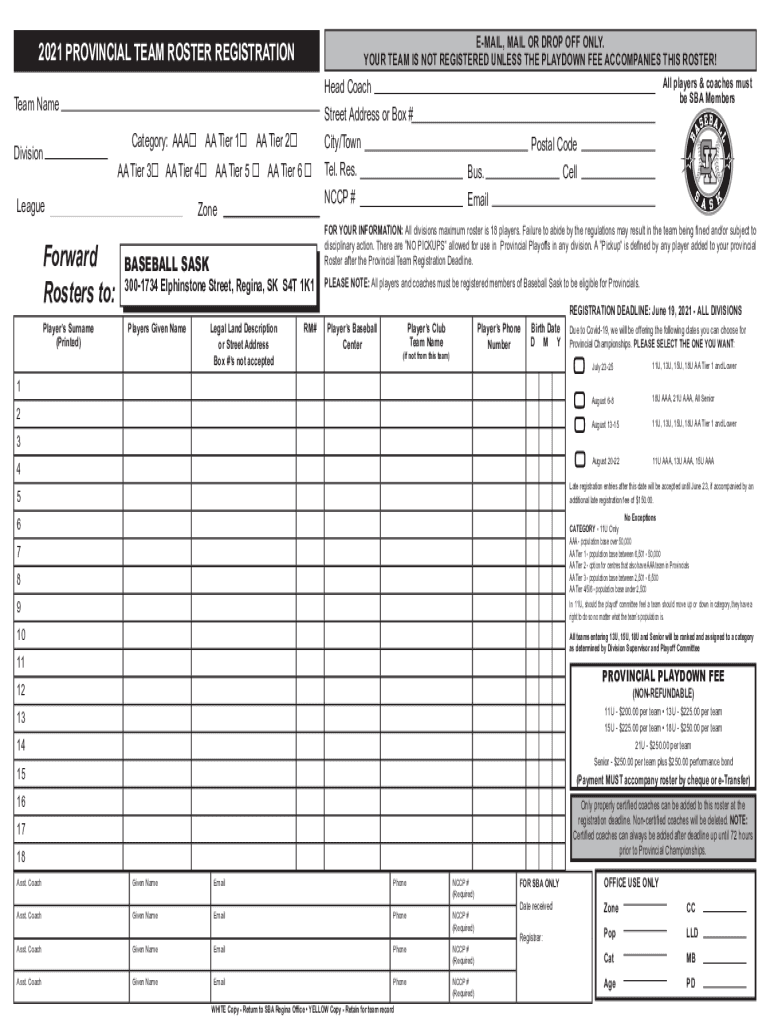EMAIL, MAIL OR DROP OFF ONLY. YOUR TEAM IS NOT REGISTERED UNLESS THE PLAYOFF FEE ACCOMPANIES THIS ROSTER!2021 PROVINCIAL TEAM ROSTER REGISTRATION Team Name DivisionCategory: AAAAA Tier 3 AA Tier 4LeagueForward