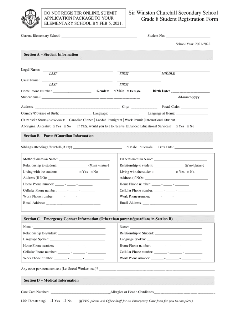 DO NOT REGISTER ONLINE. SUBMIT APPLICATION PACKAGE TO YOUR ELEMENTARY SCHOOL BY FEB 5, 2021. Sir Winston Churchill Secondary School Grade 8 Student Registration Concurrent Elementary School: Student